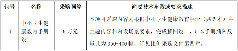 中国健康教育中心就“中小学生健康教育手册设计”项目进行比价采购,诚邀具备相应资质的供应商前来参加。
